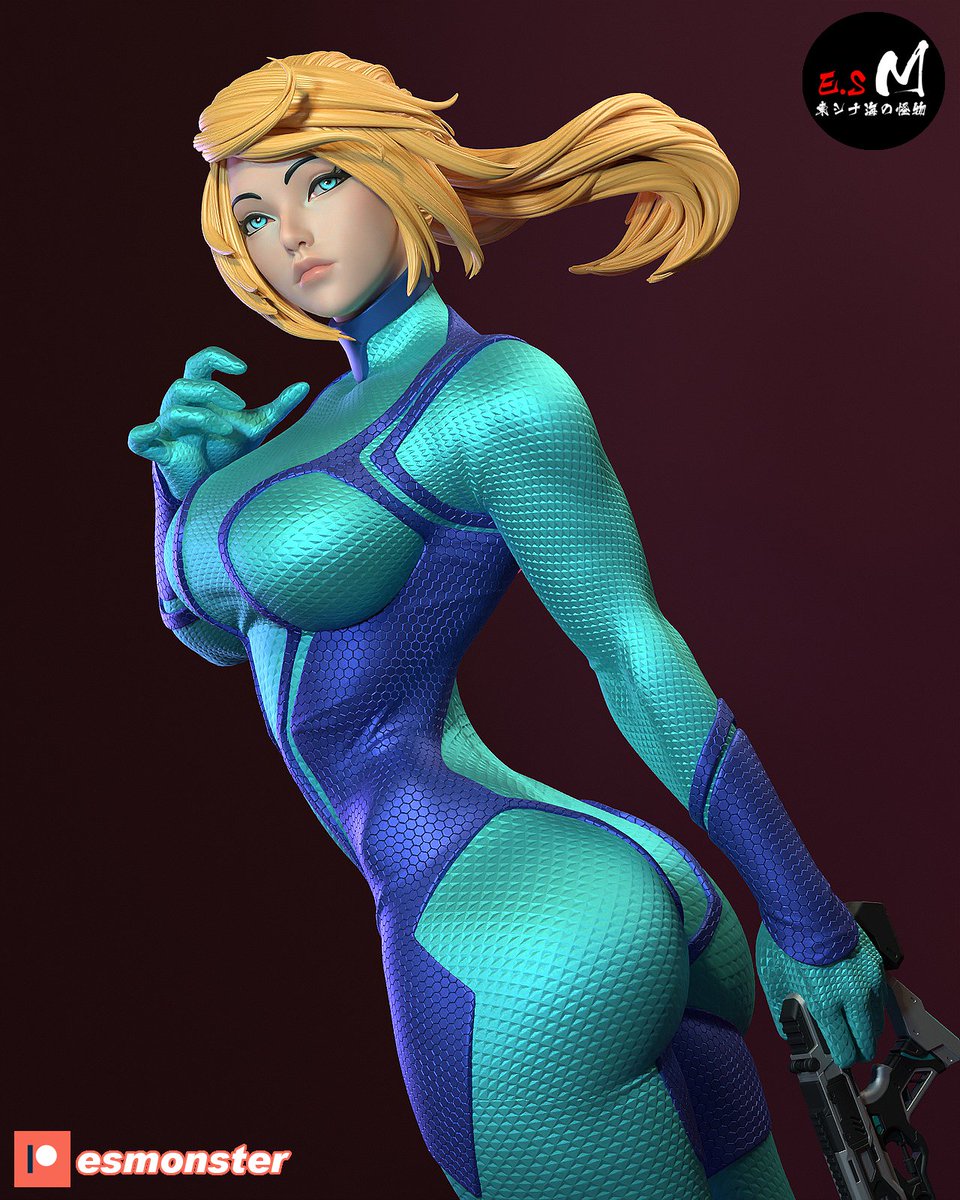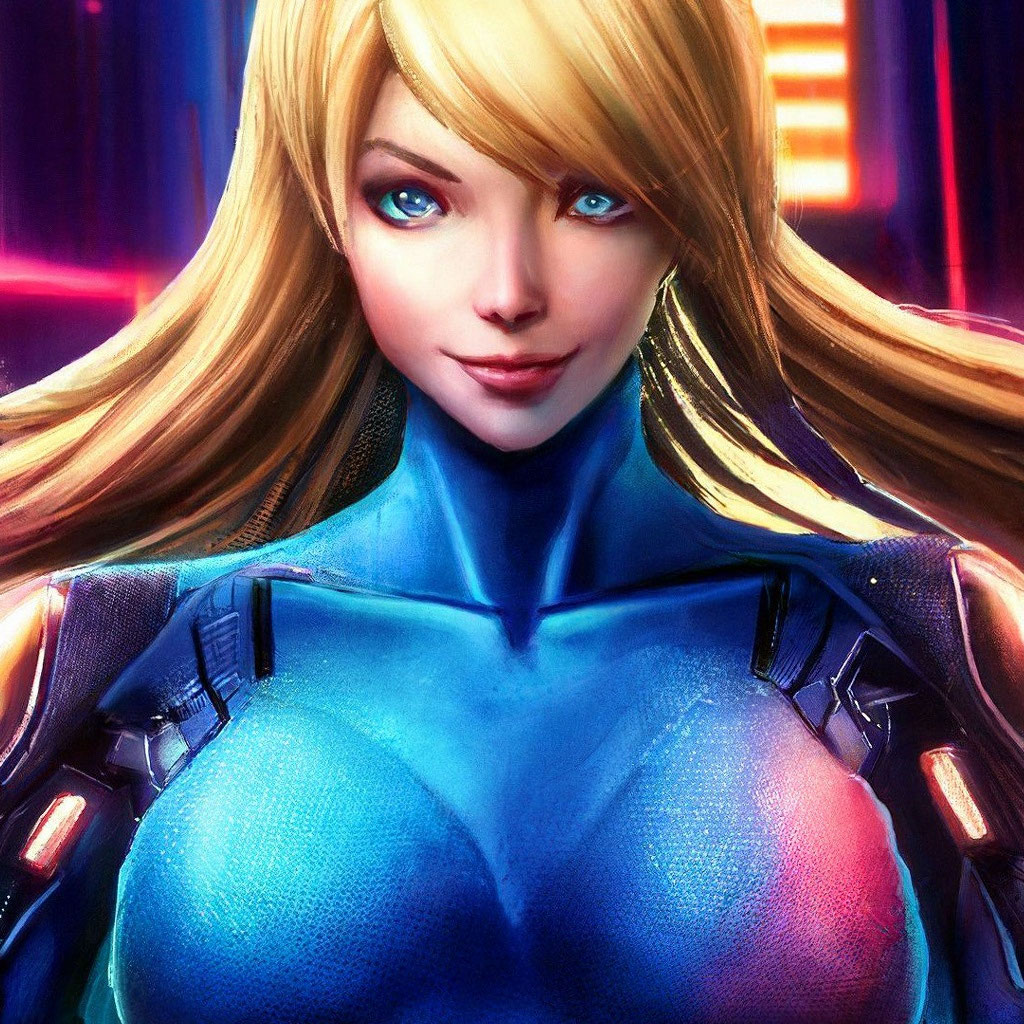 "Samus Aran in a zero suit smiles and hides his hands behind his back, neon back